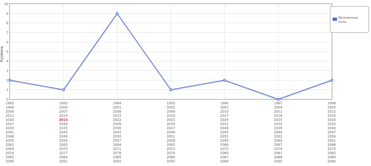 7 - Символизирует исследование неизвестного. В этот период возможно увлечение духовной практикой, медитацией, исследовательской работой. Если семерка является точкой спада (после нее график идет вниз), — вероятно, необходимо пересмотреть взгляды на отношения в семье. Если же семерка становится точкой подъема (после нее график идет вверх), это говорит об укреплении отношений не только с родственниками, но и с коллегами, друзьями и окружающими в целом.